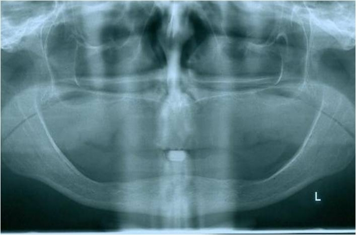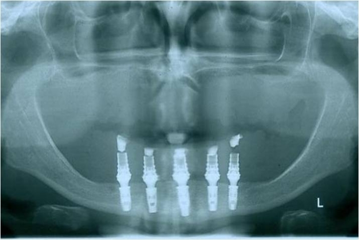 Raio x após prótese imediata fixa inferior e nova prótese superior, provisórias instaladas