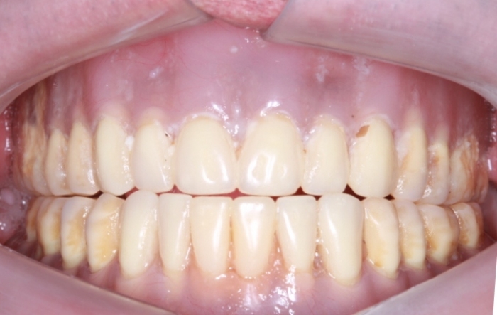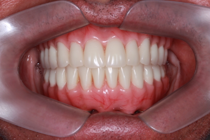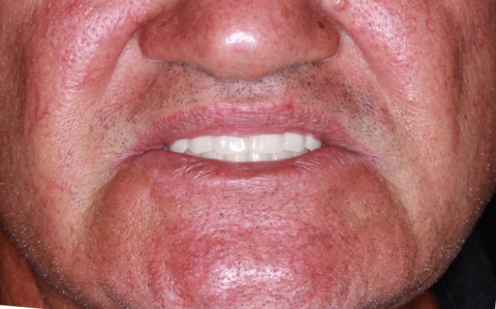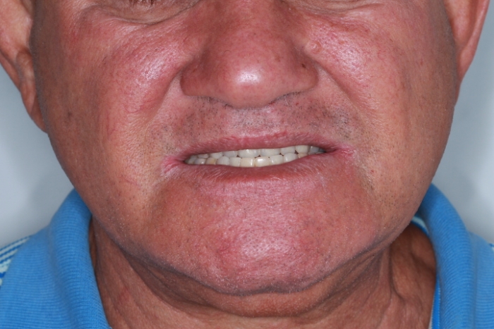 Prótese fixa sobre os implantes inferiores e nova prótese total superior, em Janeiro de 2016