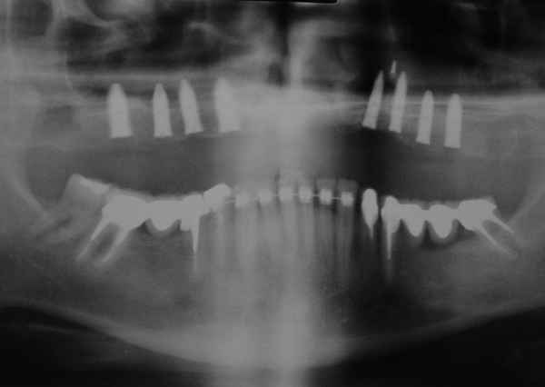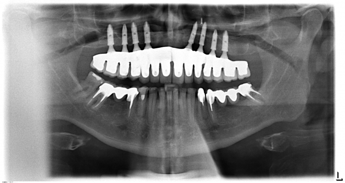 Raio X com 08 implantes Cone Morse instalados na maxila