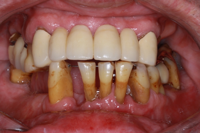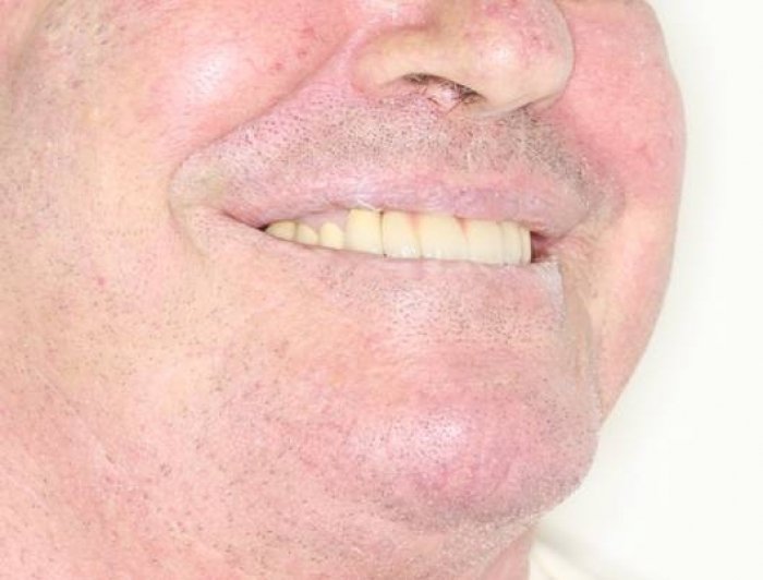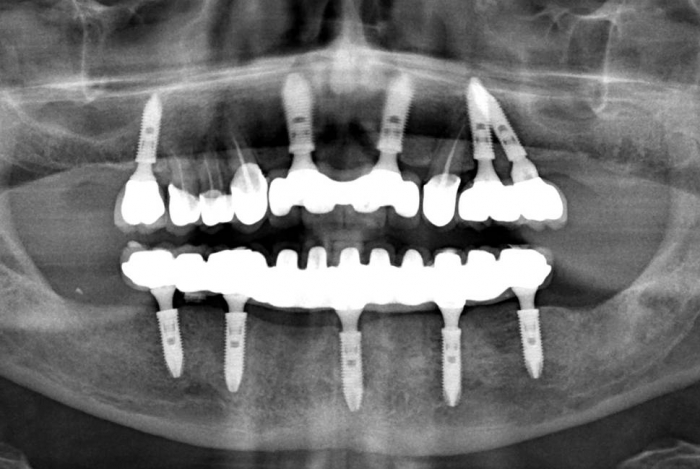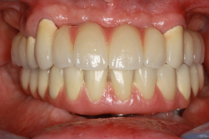 Próteses fixas em porcelana superior e inferior sobre implantes Cone Morse