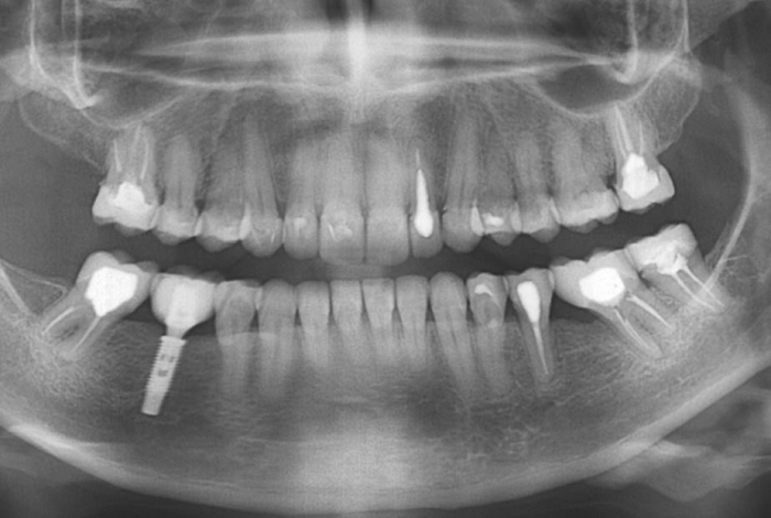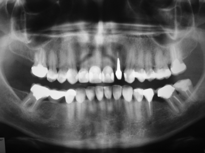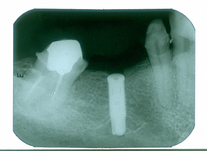 Raio X com prótese fixa em porcelana sobre implante Cone Morse