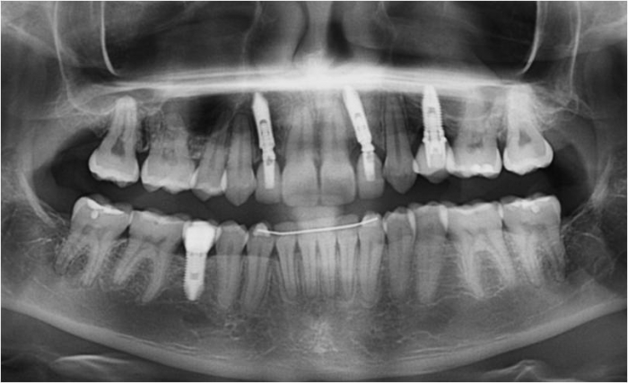 Raio X final com próteses em porcelana sobre implantes