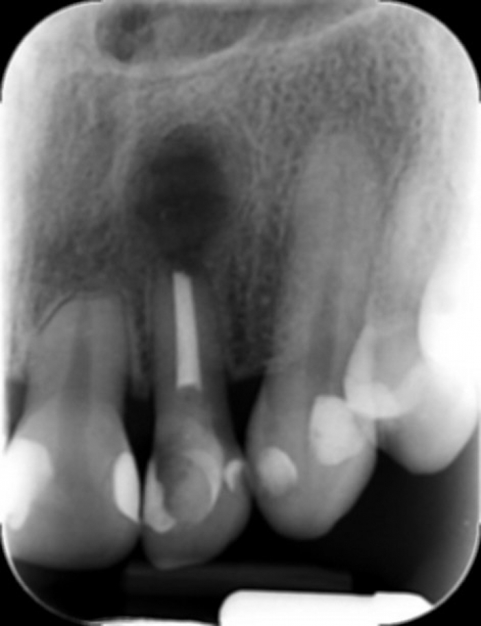 Raio x após curetagem da lesão e plastia apical do dente 22