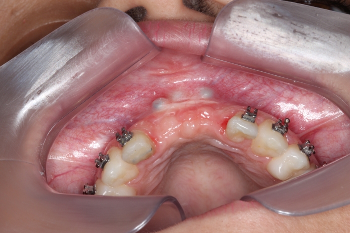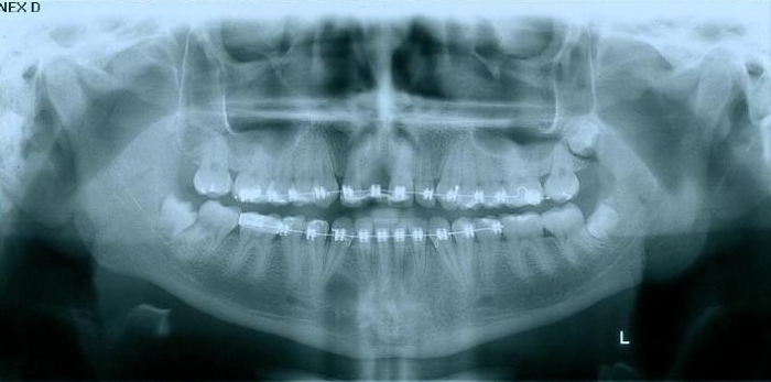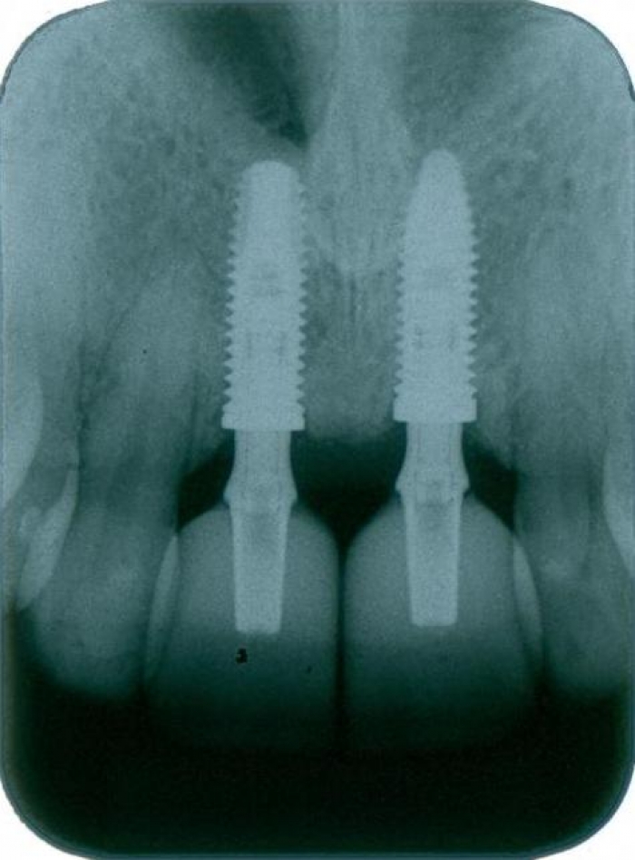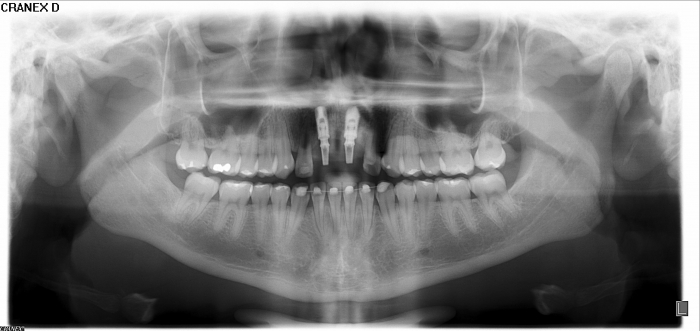 Raio x em 2014, após enxerto em bloco com osso da mandíbula.