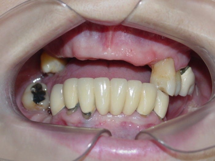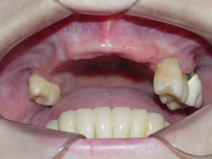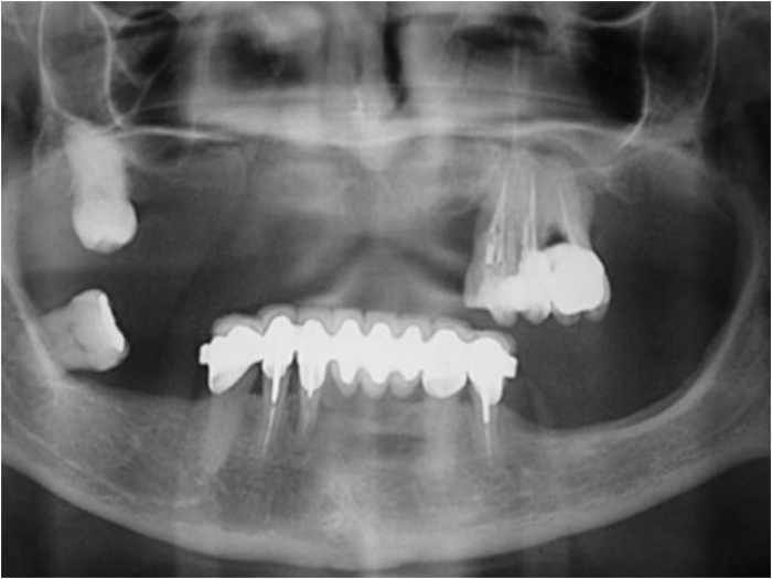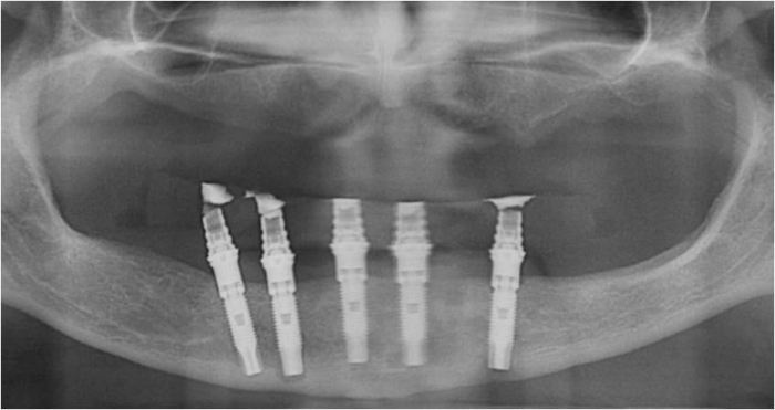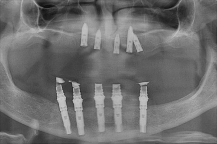 Rx após extração dos dentes e instalação de 05 implantes e prótese fixa imediata