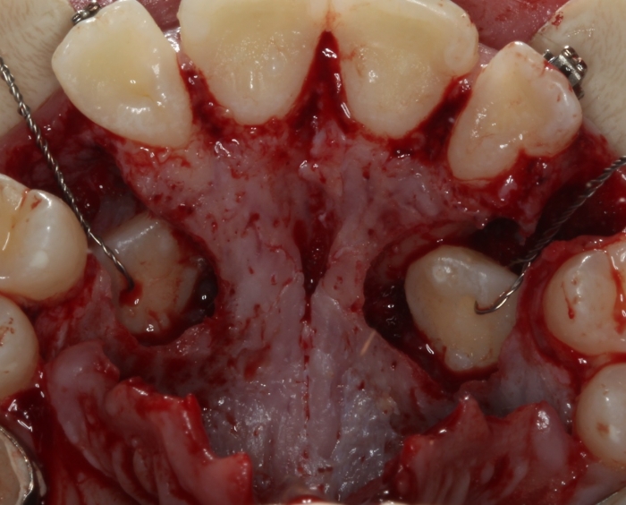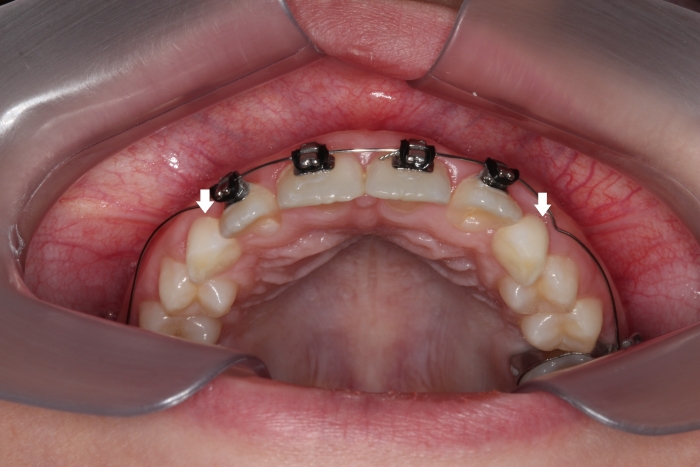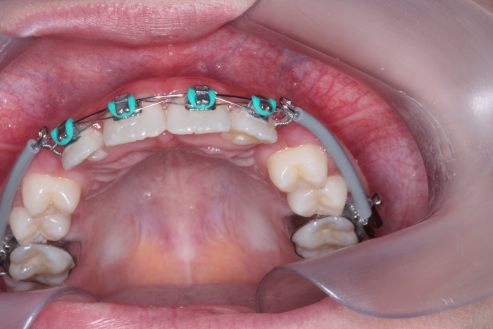 Cirurgia com fio de aço instalado para tracionamento dos caninos permanentes